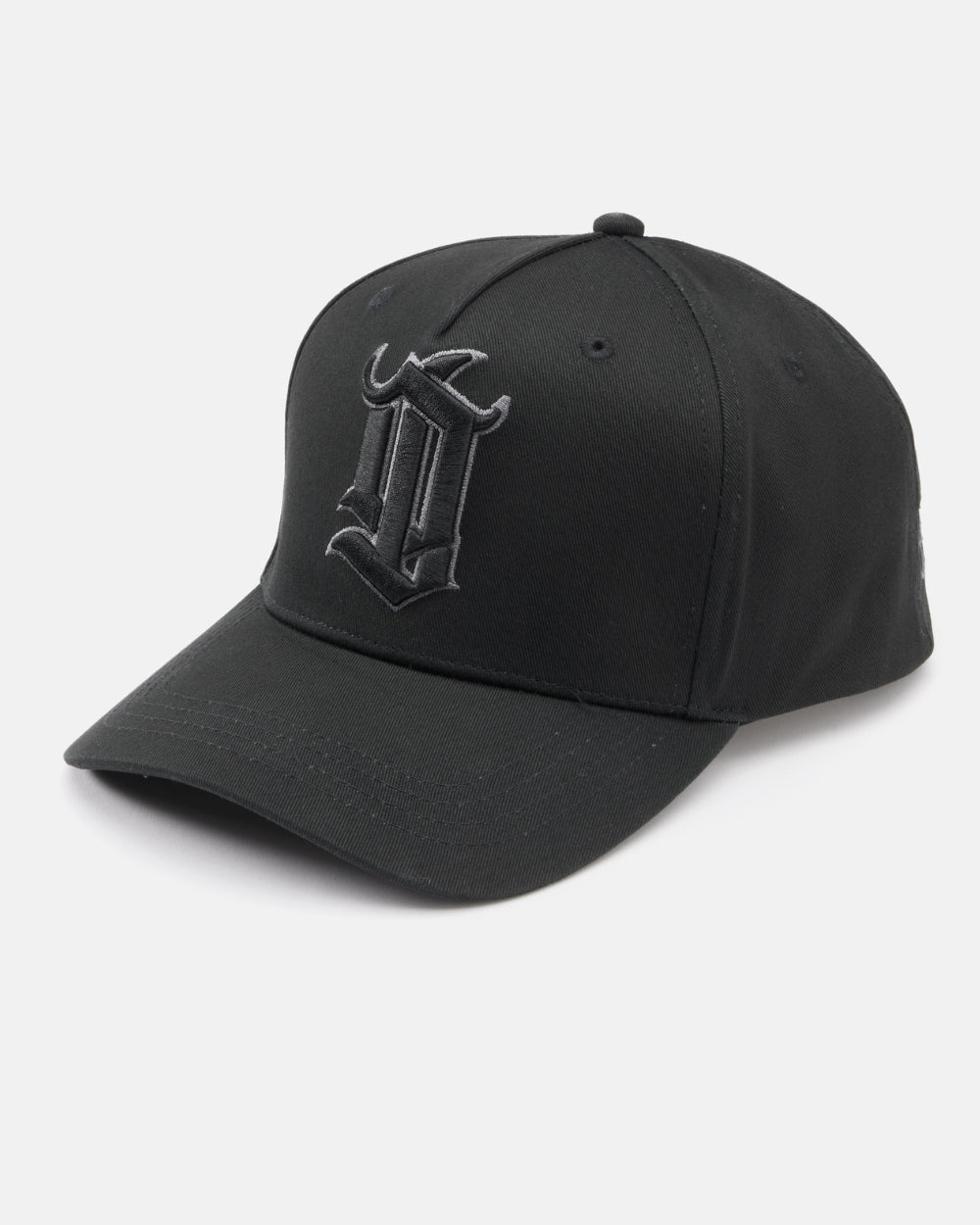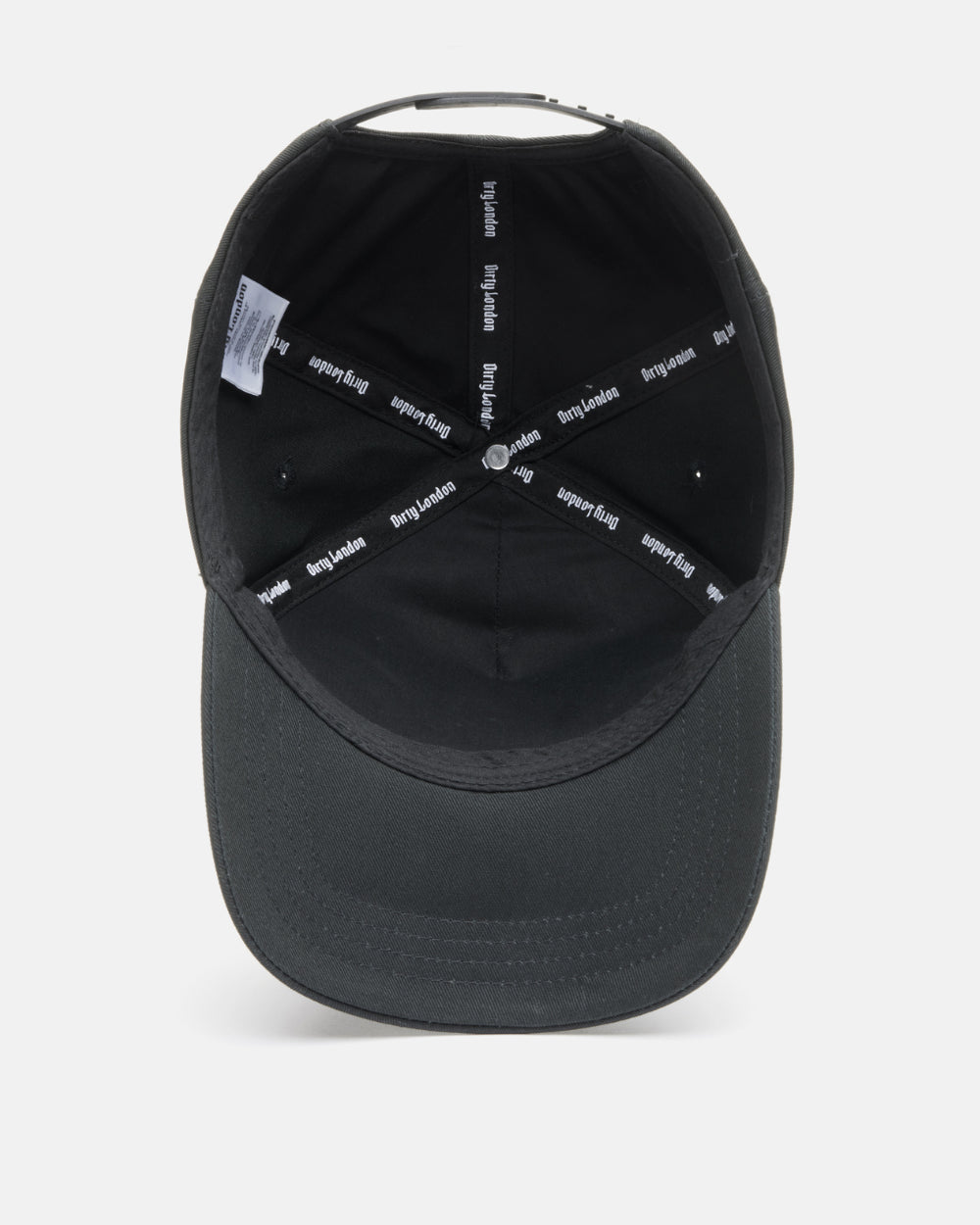 Black baseball cap with contrast DL monogram in a 3D embroidery. Our new structured panel cap has a curved visor and comes with a snap back adjustment. The back of the cap features a self-coloured embroidered arched Dirty London logo.
